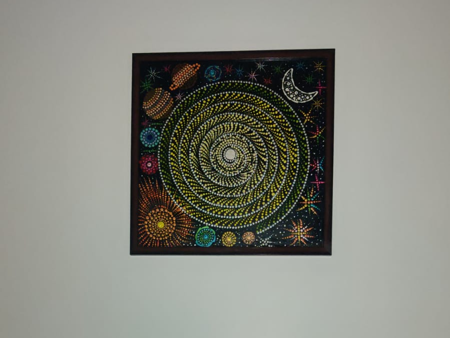The dotted artwork pulls the viewer in by not just the spiral galaxy in the middle, but by the fineness of the piece. At first glance it might look simple,  but once your eyes begin to linger the viewer can see the details of the solar system.